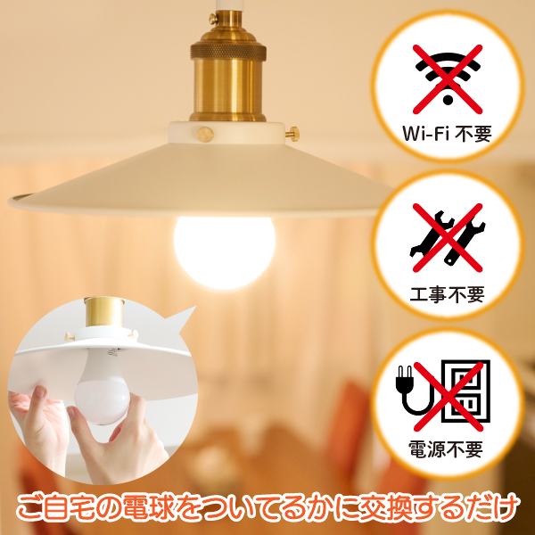 ご自宅の電球を「みまもりライト ついてるか」に変えるだけでご家族様を見守ることができます。電球内にSIMが内蔵されているためWi-Fi不要、特別な工事や電源も不要です。24時間の間で電球のON/OFFが検知できない場合、異常検知と判断しお知らせを受け取ることができます。